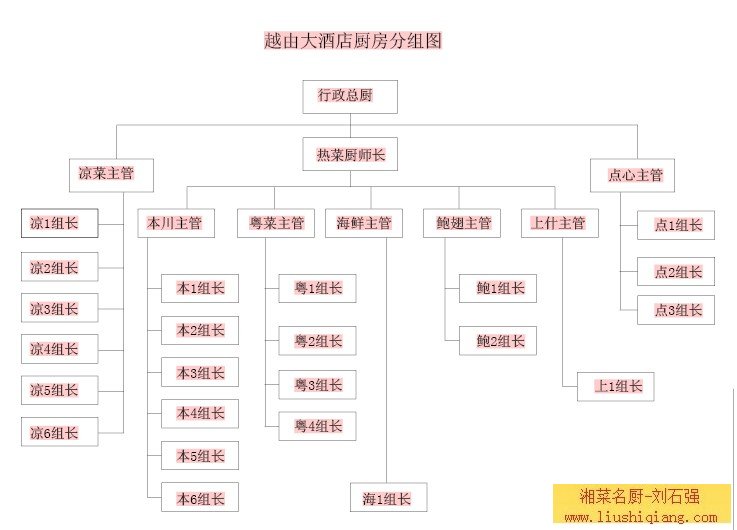 厨房分组管理方法。我们团队通常,酒店厨房人员结构为“行政总厨、部门主管、部门成员”三个层次,但是上海越由大酒店的厨房采取“部门内分组”,分别在凉菜、热菜、点心三个部门内细分小组,改为“行政总厨、部门主管、小组长、组员”四个层次。