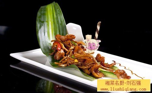 鸭肉为餐桌上的上乘肴馔,也是人们进补的优良食品。但在中医看来,鸭肉性味甘、寒,入肺胃肾经,有滋补、养胃、补肾、止咳化痰等作用。凡体内有热的人适宜食鸭肉,体质虚寒、食欲不振的人却不宜食用。而灵芝菇的温补效果恰能与其互补,这样的搭配组合堪称绝配。加之菜名中的“杏鲍菇”较为吸引人,此菜一经推出,大受欢迎。可见好的组合能给菜品大大加分。 原料:鸭脯肉100克,杏鲍菇150克,四米料头10克。 调料:干锅酱20克,湿淀粉、李锦记天成一味、风味豆豉酱各5克,鲜柠檬汁、葱油、黄油各15克,蚝油3克,味达美老抽2克,色拉油400克(约耗50克),高汤500克。 制作:1.杏鲍菇切成一指条,下入五成热的色拉油中炸至金黄出香,用高汤煨至入味。 2.将鸭脯肉切成0.2厘米厚的片,加入家乐干锅酱、李锦记天成一味,挤入鲜柠檬汁,拌匀后腌制入味。 3.不粘锅上火,放入黄油10克慢慢烧热化开,放入鸭脯肉,两面煎至八成熟,捞出沥油。 4.另取圆底净锅上火,内放葱油10克,下入干锅酱5克,煎鸭肉的原汁一半,放入煨好的灵芝菇炒香装盘。 5.锅内放葱油、黄油各5克炒香四米料头,爆香干锅酱、风味豆豉酱,加入高汤10克,放入煎好的鸭脯肉,调入老抽、蚝油,更多特色湘菜就在刘石强湘菜厨师网 ,收浓芡汁即可。 特点:豉香微辣,咸鲜适中,回口微甜,口味丰富。 干锅酱与柠檬汁一起腌鸭脯:原来在制作鸭脯肉菜品时多用酱油、蚝油腌制,而此菜大胆地采用干锅酱来腌制,这样成菜鲜香味和酱香味会更浓、更特别。同时我们还加入了几克柠檬汁,千万别小看这点柠檬汁,它的酸味与干锅酱融合能产生独特的香气,这也是此菜的一大秘密。同时腌制时放入鲜柠檬汁可让肉质更嫩,但不能太多,多了酸味太重影响口感。 滑油变油煎:此菜改变中餐滑油的做法,改为用黄油煎制而成,能更好地为鸭肉增加浓浓的奶香味,使鸭肉的档次提高了不少。 炸后再煨更筋香:我们常用做法是先拿新鲜白灵菇用高汤煨制入味,再改刀烧制或过油炸,但成品有一股异味。在制作此菜时改为先将菌菇改刀,直接入油炸香,再用高汤煨至入味,菌香味更足、口感更佳。 煎鸭原汁不能丢:鸭肉含水量大,煎制后会出现一些汤汤油油的液体。这些液体可不能丢,在此菜中用黄油煎出的鸭汁原汤留用,在烧制时加入,更能保证菜品的原汁原味。同时相当于将煎过的黄油再次入菜,既能为成菜增加奶香味,又能节约成本。 湘菜厨师网 湘厨刘石强厨房管理团队荣誉出品 |