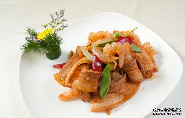 热锅中的油烧到四成热时,就可以放肉了。这里有一个细微处需要注意:切好的肉放了一阵子,肉片会粘连在一起,若下锅后用勺子将其炒散,则肉片上的肥瘦两部分容易分离。而若是等到肉片粘连部分的油化开自己分散,又容易下焦上腻。我的办法是将煮肉的汤放在煲仔炉上小火保持温度,不用太高,70℃足矣,肉片下锅前,先放在漏勺内下入汤中汆散,沥水后再上锅煎,这样肉片的肥瘦不断,吸入的汤汁还能帮助其保持嫩度。湘菜名厨解读 回锅肉特色做法.更多特色湘菜美食就在刘石强湘菜名厨网 。
