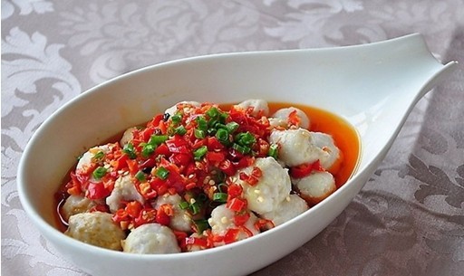 菜品做法:取鱼丸15个入碗,加两勺蒸鱼剁椒,蒸6分钟即可。湘菜创新菜肴 剁椒蒸鱼丸.更多特色湘菜美食就在刘石强湘菜名厨网。