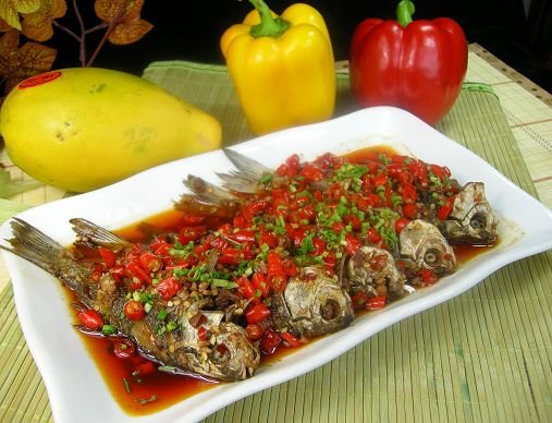 2、木姜辣油及料渣共50克、蒜末30克、姜末10克、红酱油12克(以黄豆酿造而成,颜色发红,浓度介于老抽和生抽之间,微带甜口,可以用老抽加红糖熬制成的复制酱油代替)、白糖5克、保宁醋6克拌匀,浇在鱼身,撒腌制后的红椒圈20克即可走菜。更多特色湘菜美食就在刘石强湘菜厨师团队,