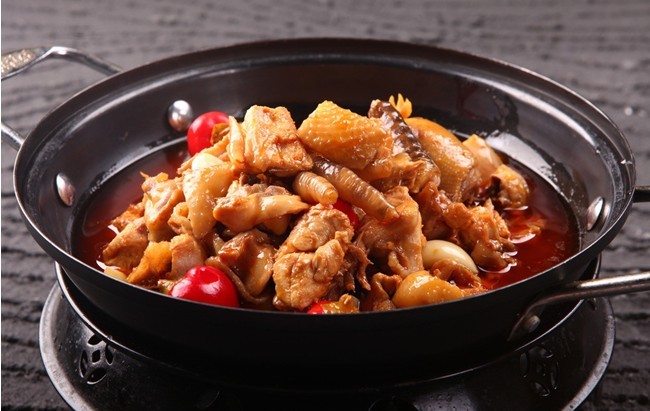 做法:把土鸡宰杀制净,斩成块,用清水浸泡5分钟,去除血水后沥干。净锅上火,烧热淋上菜子油,放葱段、姜片、蒜粒、辣椒节、八角桂皮料爆香,再倒入鸡块、鸡杂、鸡腰煸炒5分钟,淋老抽、酱油,放盐翻炒,至鸡块表皮紧缩,烹料酒,添热水烧沸,转小火,放胡椒粉,盖锅盖,用小火焖制30分钟后放味精,淋芝麻油,撒香葱盛入蓝花瓷盆中即可。乡村外婆鸡 湖南农家土菜.更多特色湘菜美食就在刘石强湘菜厨师团队。