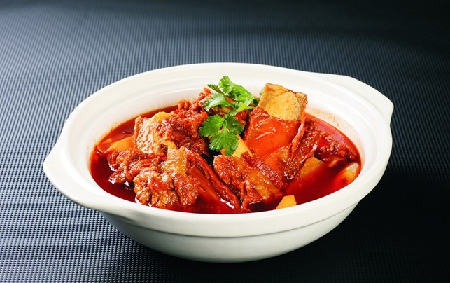 预处理:1.锅内放入色拉油500克,烧至五成热时,放入小香葱段200克、香料(香叶20克,八角、桂皮、白豆蔻、干辣椒各50克)、红九九火锅底料1包、郫县豆瓣400克、海鲜酱30克、排骨酱50克,小火煸炒至豆瓣发酥,倒入高汤12.5千克、牛排、黄飞红香辣酥150克、鸡精55克、味精30克、白糖15 克、老抽(根据汤汁的颜色酌量添加)大火烧开,改小火烧制2小时,将排骨捞出,汤汁过滤存放。