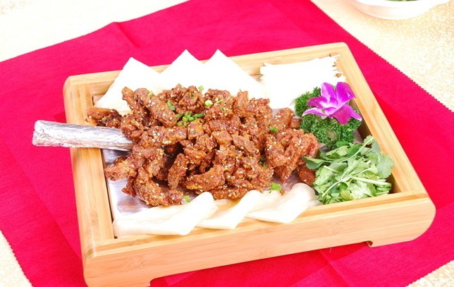 选用内蒙鲜嫩的羊腿肉,肉质细嫩,加入各种香料煮后晾凉,撕成条,轻轻拍一层生粉,炸至干香,下入各种调料炒制,看似简单,但是有两点要注意,羊肉一定要晾凉后再撕,热着撕容易撕碎;生粉拍一层,过多会掩盖羊肉的鲜美。取羊腿2.5千克,加草果、香果、陈皮各2克,丁香、花椒、香叶各1克,八角3克,孜然15克,辣椒5克,老抽10克,蚝油20克,加水3千克,放入大桶内大火烧开,改小火煮熟。羊肉捞出晾凉,撕成小拇指大小的条,走菜时取肉300克,轻轻拍一层生粉。将羊肉入七成热油炸(大约30秒)至外焦里嫩,捞出控油。