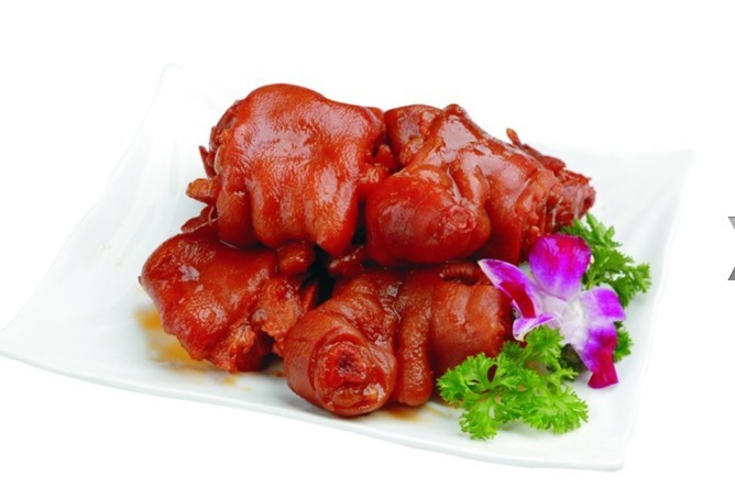 3、卤好猪手后,起锅之前的10分钟里加入肉宝王(5千克卤水放大约30克肉宝王,因为肉宝王是浓缩调料)。肉宝王是一种特别香的调料,如果放早了,其香味就散尽了。卤好的猪手起锅后,放在通风处,刷上明油,这样可保持猪手不变色,即使当天用不完,第二天再用卖相也好。更多特色湘菜美食就在刘石强湘菜厨师团队。