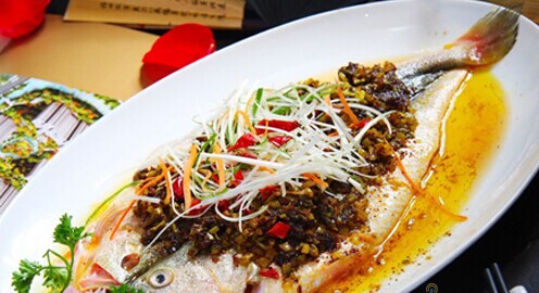 湘菜加盟店招牌菜 浏阳豆豉雪菜蒸黄鱼。浏阳豆豉是中国最早有文献记载的豆豉,有上千年的制作历史。深度发酵的黑豆豉,选用湖南当地的黑豆,历时两个月发酵而成,色泽乌黑油润、豉肉松化、豉味浓香,更多特色湘菜美食就在刘石强湘菜厨师网。