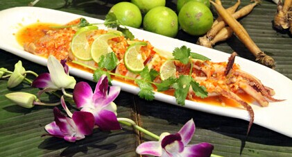 泰式酸辣柠檬鱿鱼 泰国餐厅特色招牌菜。刘石强湘菜厨师团队大厨选择鱿鱼的诀窍。我们这次买的鱿鱼和以往的颜色不太一样,以往的鱿鱼剥皮后是雪白的,这次是红色的,据卖鱿鱼的说,这种鱿鱼烤好后就是风琴鱿鱼。让鱿鱼更好剥皮的窍门是。在浸泡清洗鱿鱼的水中加少许白醋,一来可以去腥,二来鱿鱼皮很轻松撕下来、打鱿鱼花刀的窍门:刀都是倾斜45度角,正反两方向,这样打出的鱿鱼花刀均匀。鱼露和甜辣酱的咸度已经够了,可以不放盐了,但也可根据个人口味加入少许盐和糖其实让鱿鱼脆嫩好吃的窍门就三步:去皮打花刀焯水1、鱿鱼一定要清理干净,去除内脏和鱿鱼黑色表皮、打花刀的时候一定要有深度,但绝不能切断,花刀不但可以使鱿鱼受热卷曲,还能使鱿鱼更入味、要想鱿鱼嫩,就要先焯水,沸水中20秒即可,炒的时候翻炒几下即可出锅,鱿鱼加热过度就是橡皮一样的硬。今天我们做的这道鱿鱼是在原来的基础上做成整条的。看上去更加美观。也是一种创新。烹饪方式还是一样的。更多特色湘菜美食就在刘石强湘菜厨师网。