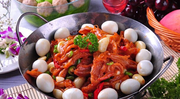 主料:上等去骨鸭掌600克,鹌鹑蛋10—12个。