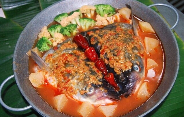 制作过程: 鱼头洗净、切为两半,在鱼肉部分打十字花刀,加适量的葱姜、料酒、盐腌制10分钟待用。 锅里加藕片垫底,放入鱼头,加老母鸡汤至没过鱼头一半,在汤中加辣妹子酱30克和少许鸡粉,在鱼头上放红腌椒30克,将电磁炉调到爆炒档,煮3分钟,撒少许盐,加盖焖12分钟,开盖儿,舀起鱼汤淋到鱼头上,反复淋10次。 取一砂锅,加10克鲜紫苏叶垫底,将鱼头带汤一同倒入砂锅中,放京葱丝和韭菜段,盖上盖儿,配卡式炉上桌。更多特色湘菜美食就在刘石强