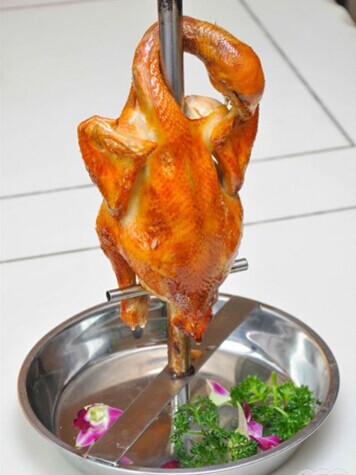 制作方法:小公鸡1只宰杀制净,放入盆内,加入姜、大蒜、芹菜、香菜各100克,圆葱200克,洗净后切成小丁。秘制香料。绿茶水腌制一晚。 将腌料填入鸡的肚子内,用钩子挂住鸡的脖子,用吹风机把鸡的表皮吹干(约耗5小时)。大铁锅内放入干绿茶叶、香叶各100克,大米400克,盖上盖子,开火加热至熏料冒烟,揭盖后放入不锈钢篦子,将小公鸡放在篦子上,盖上盖子,用小火熏制1小时,离火取出小公鸡。 客人点菜时,把鸡插入钢管餐具上。图片上一样。同时搭配泡黄瓜条、泡胡萝卜、白萝卜条各50克,果汁茶1壶和蘸料一碟上桌即可。在熏制过程中,小公鸡要经常翻面,否则上色不够均匀。 更多特色湘菜原料就在刘石强湘菜厨师网