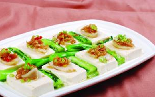 制法:1、内脂豆腐整块倒入蒸盘中,用筷子在中间插上12下插出小洞,洞中放入盐和味精,上笼猛火蒸90秒取出待用。2、净草鱼片放盐、味精码味后用生粉 和鸡蛋清上浆,盖在蒸好的内脂豆腐上,再入蒸锅猛火蒸90秒取出。3、炒锅上火,入鸡汤、青红椒末、盐1克,勾流芡淋在内脂豆腐上,撒胡椒粉、大葱丝、淋 5克沸油,放一片香菜既成。更多特色湘菜原料及餐饮管理知识就在刘石强湘菜厨师网