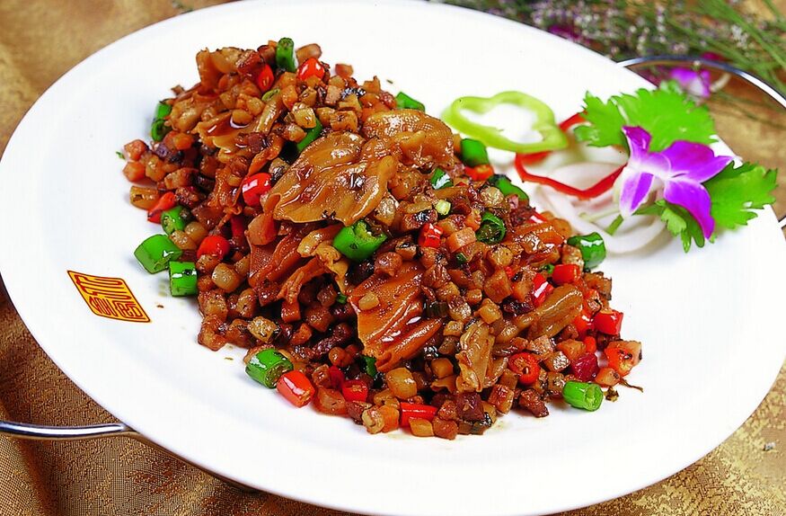 4、锅内下牛肉、鸭掌和压制牛肉的汤汁200克收干,倒入用大蒜叶和鲜红椒圈装饰即可。更多特色湘菜及餐饮管理知识就在刘石强湘菜厨师网。