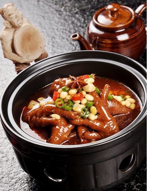 制作过程:凤爪剪去趾甲,汆水后过油炸至金黄色捞起。净锅上火入A料炒香后,加入凤爪,添入清水5千克煨制2小时,再入花生煨制1.5小时,装盘时花生垫底,凤爪铺面上,淋入煨制的汁即可。在菜品上面散一些黄豆和青红椒碎做点缀,或者其他也可以。更多特色湘菜美食及餐饮管理知识就在刘石强湘菜厨师团队 。