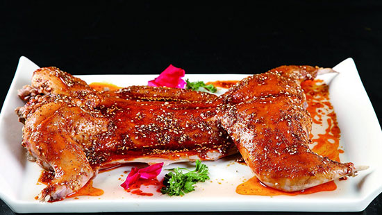 制作:把西芹、洋葱、胡萝卜、香菜切成小块,加清水和调料混合成腌料汁待用。兔子在清水中漂去血水(如图1),入腌料汁中腌制一夜控干水分。把调料调匀后用刷子在兔子的内外两侧刷匀,放在托盘上入烤箱(上火220°、下火180°)烤20分钟(其间翻动两次),取出再刷一层调料.再烤约25分钟,其间正反翻动两次,最后烤干时涮清色拉油一次,再烤4-5分钟即可出炉,整个烤制过程约45分钟,将烤好的兔子改刀切块,摆成整形即可食用。上桌时跟上孜然风味料即可。更多特色湘菜加盟美食及餐饮管理知识就在刘石强湘菜厨师网 。
