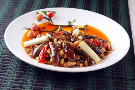 制法过程:把海参片投入加有鸡汁的高汤锅煨入味后,捞出来待用。净锅里放少许油烧热,下姜粒、蒜粒、酱肉粒和鲜肉粒先炒香,再加香菇粒和冬笋粒,放蚝油、盐、胡椒粉、白糖和味精一起炒匀,等倒入海参片并撒香菜末、韭菜花末、小葱弹子和小米辣圈炒香后,淋入少许香醋和香油,起锅装盘并在盘边摆上锅摊,即成。锅摊属于北方特有的小食。卷在一起吃更有一番风味。把面粉、鸡蛋、葱花和适量的水纳盆,搅匀成糊,再入锅煎成片状,取出后用圆型模具压制成圆形。更多特色湘菜美食及餐饮管理知识就在刘石强湘菜名厨网。
