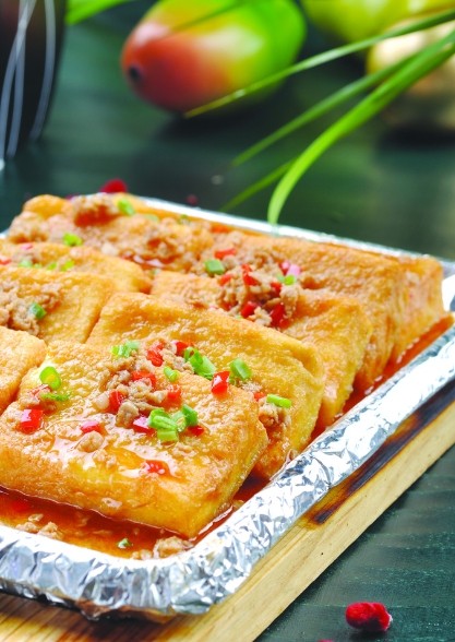制作方法 、将豆腐切成长4厘米、宽3厘米、厚2厘米的长方体,从一面开小洞抠出里面的豆腐成盒子,葱切成葱花。五花肉、马蹄跺成末,姜、蒜切成米粒状,放在剁好的五花肉、马蹄末中搅拌均匀,放盐、味精、蛋清腌渍5分钟待用。将2中调好的馅放入抠好的豆腐盒中,粘上干生粉封口。锅放油烧至七成热放入做好的豆腐盒子小火炸至金黄色捞出,放入烧热的瓦片中,撒上葱花待用。锅上大火,放水100克,加辣妹子酱、鸡精调成稠糊后淋在炸好的豆腐盒子上,放入铁板中。再淋香油上桌即成。更多特色湘菜美食就在刘石强湘菜厨师团队。