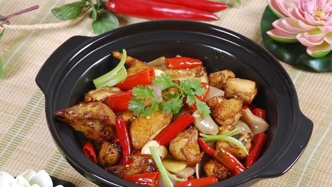 制作过程1,鸡斩小块,红葱头切片,姜切片,青椒切段备用2,小火加热砂锅,在锅内壁都刷上一层油(砂锅忌大火干烧,用砂锅做菜,一定要先擦干内外的水,开火加热时也一定要用小火,慢慢将锅温热,内壁上刷油可防干裂)3,下入红葱头,姜片用筷子翻炒,炒出葱姜味,红葱头微黄时,放入1勺风味豆豉酱、1勺柱候酱(放什么酱还是看你地方口味,多少,也看食材的多少和自己口味的咸淡)4,把酱翻炒均匀,炒出酱香味放入鸡块翻炒,小火可能有点慢,可开中火,加盖焖待鸡肉变色,肉质发紧时,加入1勺老抽、2勺红烧酱。5,沿锅边加入1勺料酒,盖盖,小火焖烧(有的直接加白酒,酒加入后,即盖上盖,焖煮,酒味易挥发,这个动作要迅速,减少酒味的挥发)6,,焖15分钟左右,开盖,翻动,加入青椒段,再煮2分钟即可(整个炒制过程不要用大火,忌急火猛烧,防砂锅炸裂,锅中不加水,也不用担心鸡会糊锅,鸡肉会煮出自身水份,和调料煮出滋味汤汁),炒时不加水,也会煮出这明晃晃浓油赤酱的汤汁.更多特色湘菜原料就在刘石强湘菜厨师团队 。