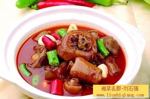 2.净锅入油,放A料爆香,注入高汤烧开,下入牛尾、山药、B料烧至入味装盘既成。更多湘菜美食就在刘石强湘菜厨师网