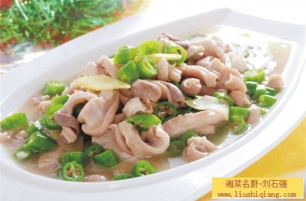 2.热油锅入猪肚,炒至金黄色时加生抽、青椒翻炒,加入原汤,入调料调味即可。
