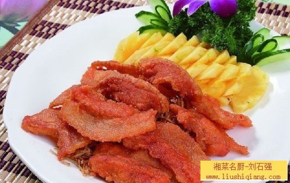 3.将腌渍料的水分滤掉,加入鸡蛋4个、生粉200克、糯米粉50克混合均匀,平铺在五花肉上,上笼大火蒸3小时,放凉后入烧至六成热的色拉油中,小火浸炸至色泽金黄,捞出控油,切成厚1厘米的大片,放入盘中,搭配鲜菠萝100克、炸酥的脆米50克、苦苣5克点缀。