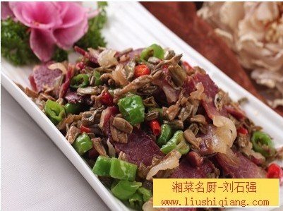 原料:风吹肉250克、卜豆角150克、蒜片、大蒜叶、青红辣椒。精盐、味精、酱油、色拉油