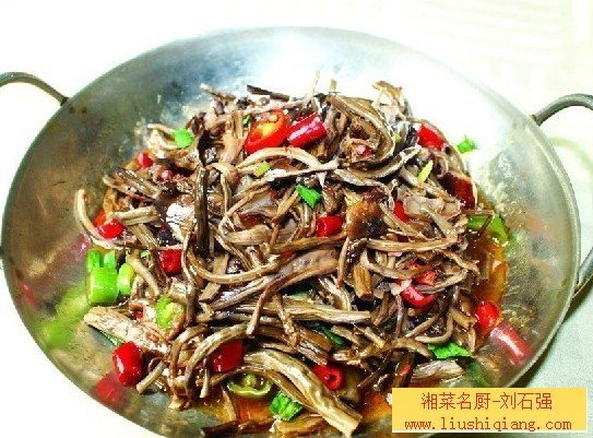 做法:1、茶树菇洗净;五花肉切薄片;青红椒切丝,大蒜切片,葱切段。