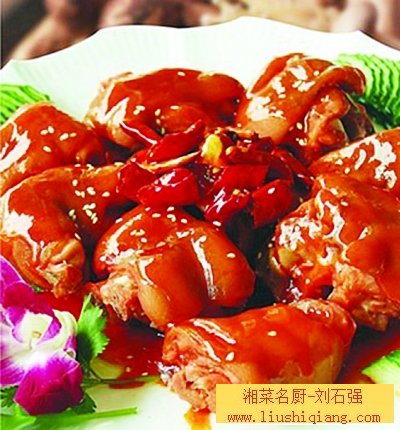 特点:猪蹄是人们喜欢食品的营养佳品,既可补虚弱,也有辅助美容之功效,含丰富的蛋白质,对老年神经衰弱、失眠有良好作用,成菜色泽红润,肉质糯而有弹性,口感醇厚,回味悠长。