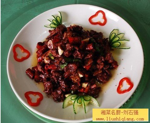 “炒血鸭”乍一听总牵起暧昧不爽的感官,看上去也是紫红色呈糊浆状,但是,在会吃鸭的人看来,鸭血可是清火败毒的一大宝。永州人自然是会吃鸭的,所以他们挑了最生猛鲜活的鸭一刀划入颈下,让鸭血淌入盛了料酒的碗内。鸭子去毛剖腹切块,再就与生姜、干红辣椒、蒜瓣一道入油锅爆炒,然后又加鲜汤焖至快干,最后将鸭血整个儿淋在鸭块上,边淋边炒,再加料起锅。鸭血香滑,鸭肉异常鲜嫩,擅吃鸭者莫过于此。