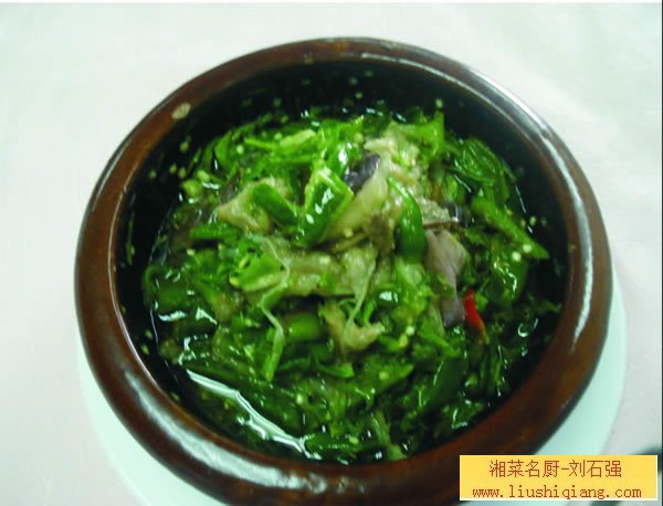 。这是一道正宗的乡土菜肴 擂辣椒茄子在做法上,茄子去把、不削皮,改刀成条后摆入托盘,再铺上一层番茄片覆膜蒸制,因使用的番茄量比较大,为防止其流出的汁水将茄肉染色,摆放时要将茄子带皮一面朝上。
