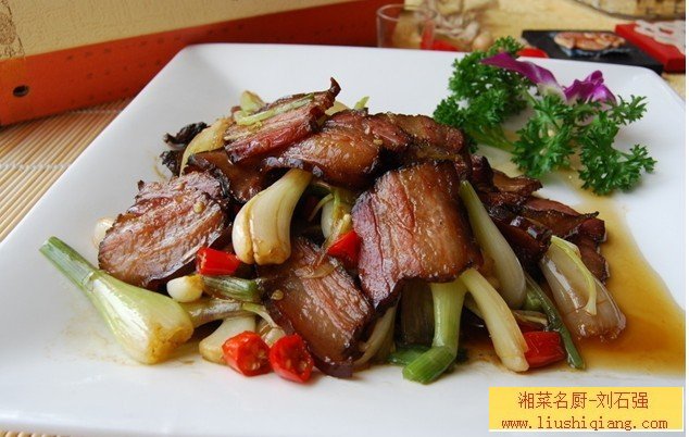 制作流程:1、锅入猪油60克,下入小米辣圈爆香,下入腊肉片小火炒出腊油且边缘开始收缩,更多特色湘菜就在刘石强湘菜厨师网,盛出待用。