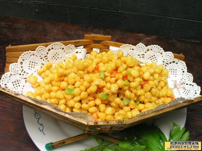 1、玉米粒拍上生粉后入八成热的油锅小火炸成金黄色,干粉丝团拍上吉士粉入六成热油中小火炸2分钟成鹊巢状,咸蛋黄入200℃烤箱中烤干搓成细末,红椒切成0.5厘米见方的小丁。、锅放底油烧至六成热,放青豆、红椒、咸蛋黄、盐、味精、白糖中火煸香,加入炸好的玉米粒,拌匀后起锅盛入鹊巢内即成。