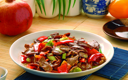 制作:1.将卤熟的羊舍切0.5厘米的厚片。