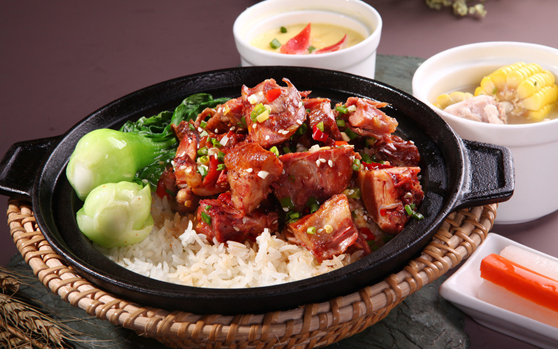 湘式煲仔饭的制作过程和要点,传统品种主要有豆豉排骨饭、腊味饭、滑鸡饭、黄鳝饭、田鸡饭、咸鱼花肉饭等,正宗的要用丝苗香米,取其坚实细密晶莹,口感好、滋味浓又易被汤汁浸烂。一般而言,生米生菜一锅煮就,以豆豉排骨饭为例,洗米上锅,煮六七成熟时揭开盖子,加入调好味汁的生排骨,沿煲边淋入酱汁香油,微火焖至饭收水,起锅巴。起盖后加入香葱,铺上青绿油菜,如果是黄鳝或田鸡时间可短一些,若是牛肉还要再长一点,要注意的是饭菜要兼顾,这就是火候了。更多特色湘菜原料及餐饮管理知识就在刘石强湘菜名厨网 。