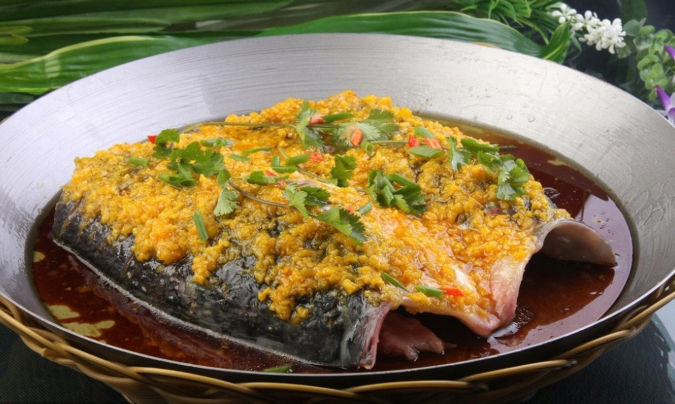 制作1.有机花鲢鱼头剖开,去掉杂质后清洗,放入A料腌制15分钟,切面朝下放入盘中。2.锅内放入纯净水600克,B料,大火烧开,改小火慢慢熬至出 香,过滤杂质。3.锅内放入菜子油,小火熬至冒烟,关火冷却至三四成热时,放入云南泡青椒,小火煸炒半分钟,出锅放在花鲢鱼头上,浇入熬好的味汁,入蒸箱 大火蒸12分钟,用香菜段点缀,然后配煮熟的宽面条上桌。更多特色湘菜加盟美食就在刘石强湘菜名厨网 .