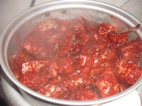 四. 将粘有液体(红曲)的鱼块,放入干净的(无水)做泡菜的瓦坛中,