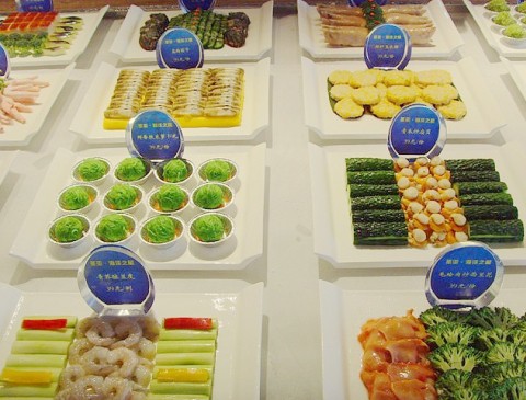 这是摆放明档的基本,一天必须最少全部换一次(特殊备案批准者例外),保持住青菜、肉类、海鲜最新鲜的颜色,也就是基本色。
