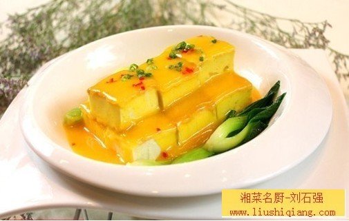 批量制作:1、锅入底油烧至六成热,下手拆蟹粉、蟹黄150克小火翻炒,烹少许米酒去腥,盛出备用。2、豆浆1500克、蛋清750克、炒好的蟹粉、蟹黄混合,调入盐15克搅匀,倒入盘内,覆上保鲜膜入蒸箱蒸约10分钟。因为蟹粉中的天然黄色素大部分已溶入油中,在蒸豆腐的过程中随油脂自然上浮,所以蒸好的豆腐像盖了一层明黄色的被子。取出托盘揭开保鲜膜,自然晾凉,每个托盘内的成品分割成12块,每块重约100克。