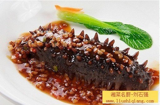 2.锅内放入熟猪油50克,烧至五成热时,放入自制的酸菜(切成小粒)50克、猪肉泥(肥三瘦七)200克,小火煸炒出香,倒入熬好的鸡汤500克,下入海参,小火烧5-6分钟,用老抽20克调味,改大火收汁,淋入葱油20克调匀,出锅装入盘中。