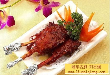 制作 :将红曲米加水50克浸泡,取红曲米水与鸭下巴加除蜜糖外的各种调料腌制1小时取出,放入烤炉烤约20分钟左右,取出,刷上蜜糖,装盘,装饰即可。