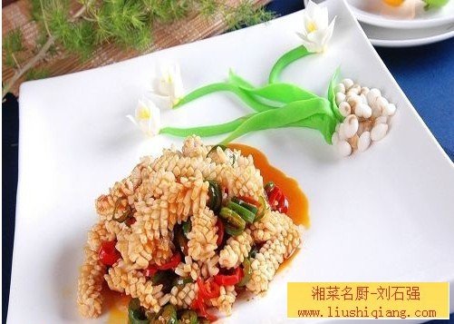 制作:1、鲜鱿鱼去内脏,除去黑皮,改花刀;青红椒、洋葱切1厘米宽的条。