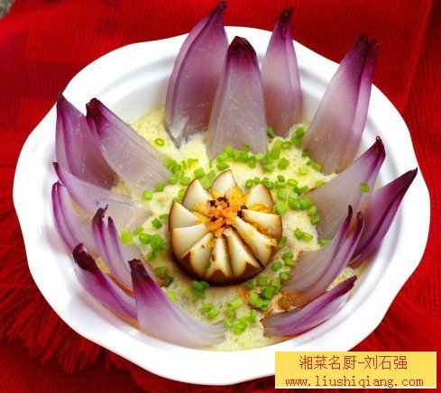 小心将洋葱一层层剥开,底部相连,每四片叠在一起,放入碗中摆成一朵莲花,中央放上一颗卤蛋; 将蛋液中加入等量的水,充分搅匀; 再将蛋液过一遍筛;将过筛后的蛋液倒入碗中,并在卤蛋中心点缀少许豆豉酱; 翻入蒸锅,大火蒸8分钟,焖2分钟,撒少许香葱碎即可。心得分享: 1 切洋葱时注意,根据自己喜欢的花瓣大小决定切几刀,底部不要切断; . 蛋液中加入等量的水,可以使蒸蛋更嫩滑; 蛋液过筛后,蒸出的蛋羹更细腻。茶香卤蛋材料:主料:鸡蛋5颗配料:姜1块、八角2个、花椒20粒、草果1个、陈皮1小块、绿茶包1个调料:卤水汁50ml、盐适量、生抽2大勺、黑胡椒少许准备:姜去皮、切片,八角、花椒、草果、陈皮放入茶包袋;做法: 1. 鸡蛋洗净,放入碗中,加水与蛋齐高,煮8分钟; 煮好的蛋立刻浸入冷水中; 待蛋冷却,小心剥去蛋壳.加入适量卤水汁、生抽和少许黑胡椒粉.更多美食就在刘石强湘菜厨师网 。