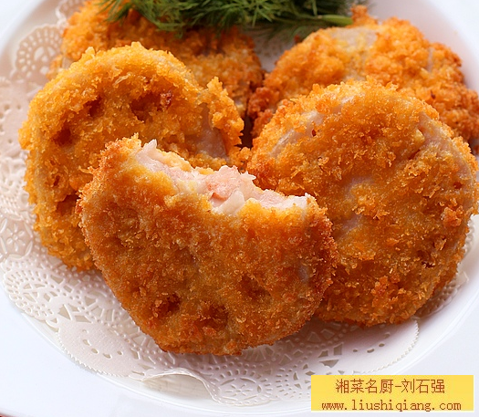 先准备一些葱姜水、将虾仁先拍松、再剁成肉泥、调入少量盐、胡椒粉、料酒、葱姜水打匀.将藕去皮切成薄片、取两片相当大小的藕片,往一片上抹上一些虾肉、用另一片压在上面成藕夹、用生粉、面粉和鸡蛋和一边清水调成浆、把藕夹放浆里均匀地裹上、再裹一层黄金面包糠、油烧至七成热,放入藕夹两面炸熟即可。
