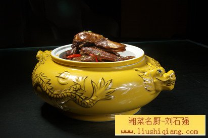 雷公鸭这是湘菜的传统菜,干香、香辣,色泽红亮,风味浓郁。斩块后盛入瓦钵内,美观大方。