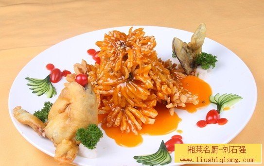 创意:这个五味鱼完全改变了传统的吃法,把台湾料理的精髓融入到鱼上。独特创新的口味和中国传统的菊花造型是此菜的灵魂。