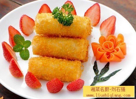 原料:槟榔芋1个、春卷皮适量、蜜红豆适量。草莓5颗