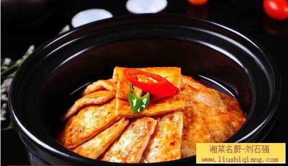 2、锅入高汤400克,调入酱油3克、生抽5克、蒜片10克、红椒圈5克、葱末5克烧开,下入煎好的豆腐块400克,小火煨4分钟(期间轻轻抖锅,连汤带料晃离锅底,防止粘锅),捞出豆腐块,起锅将热汤倒入石锅内,更多特色湘菜就在刘石强湘菜厨师网,激发出清新的香菜味,再摆上豆腐块,上桌即成。