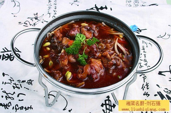 干锅牛尾是道常见又难做的菜。牛尾是个不错的原材料,此菜的做法在湘菜中比校常见,关键方法的烹制过程中,见功夫。刘石强湘菜厨师团队在这方面还是做得不错的
