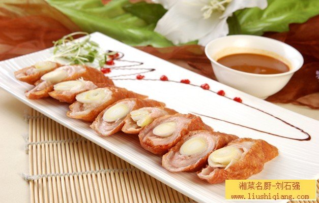 湘菜厨师网浅谈 脆皮大肠。传统的脆皮大肠是热菜,其制作流程是“大肠头制净→刷脆皮水→风干→过油炸”。我的这款菜将其改良成了凉菜上桌,“过油炸”换成“木炭烤”,把大肠里的油脂烤干,口感外焦里嫩,而且一点不油腻;上桌时配了葱丝、烙饼和自制黄豆酱,像吃烤鸭那样用薄饼卷食,颇为独特。