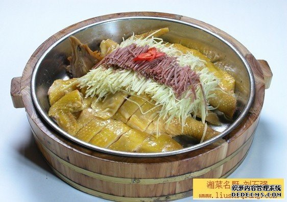 2.原汤水再烧开,下鸡至水再烧开,加盖关火浸45分钟,取出鸡,放入冰水中泡30分钟,取出沥干。3.将鸡斩重约50克的大块,放入汁料、蒜子、葱段10克搅拌均匀,再整齐地置入盘中,即可食用。更多特色湘菜美食就在刘石强湘菜厨师团队。