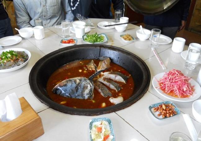鱼是用湘江 洞庭湖所生长的野生鱼种,重量都在10千克以上、生长周期都在十年以上,最重的可达百斤,这种铁锅炖鱼配上多种调料和高汤炖制而成,既经济又实惠,使人有返璞归真之感。